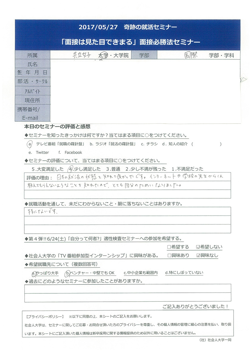 | 就職活動を通して、未だにわからないこと・腑に落ちていないことはありますか | 今日のお話を聞いて、解決しました。 |