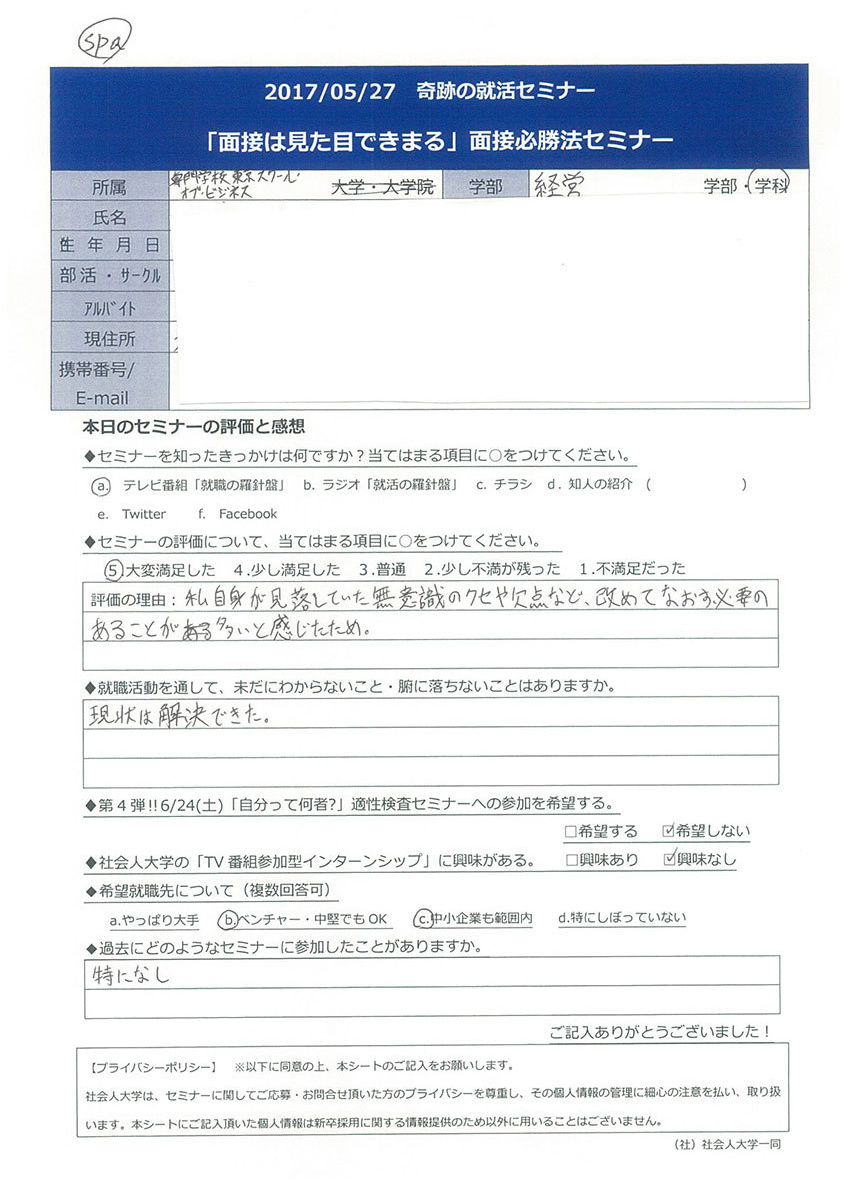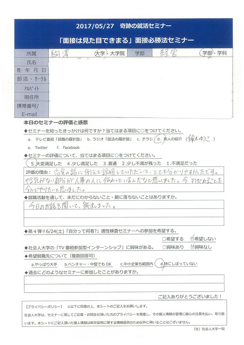 | 評価の理由 | 経営者、採用担当者視点での話を聞けたから。 |