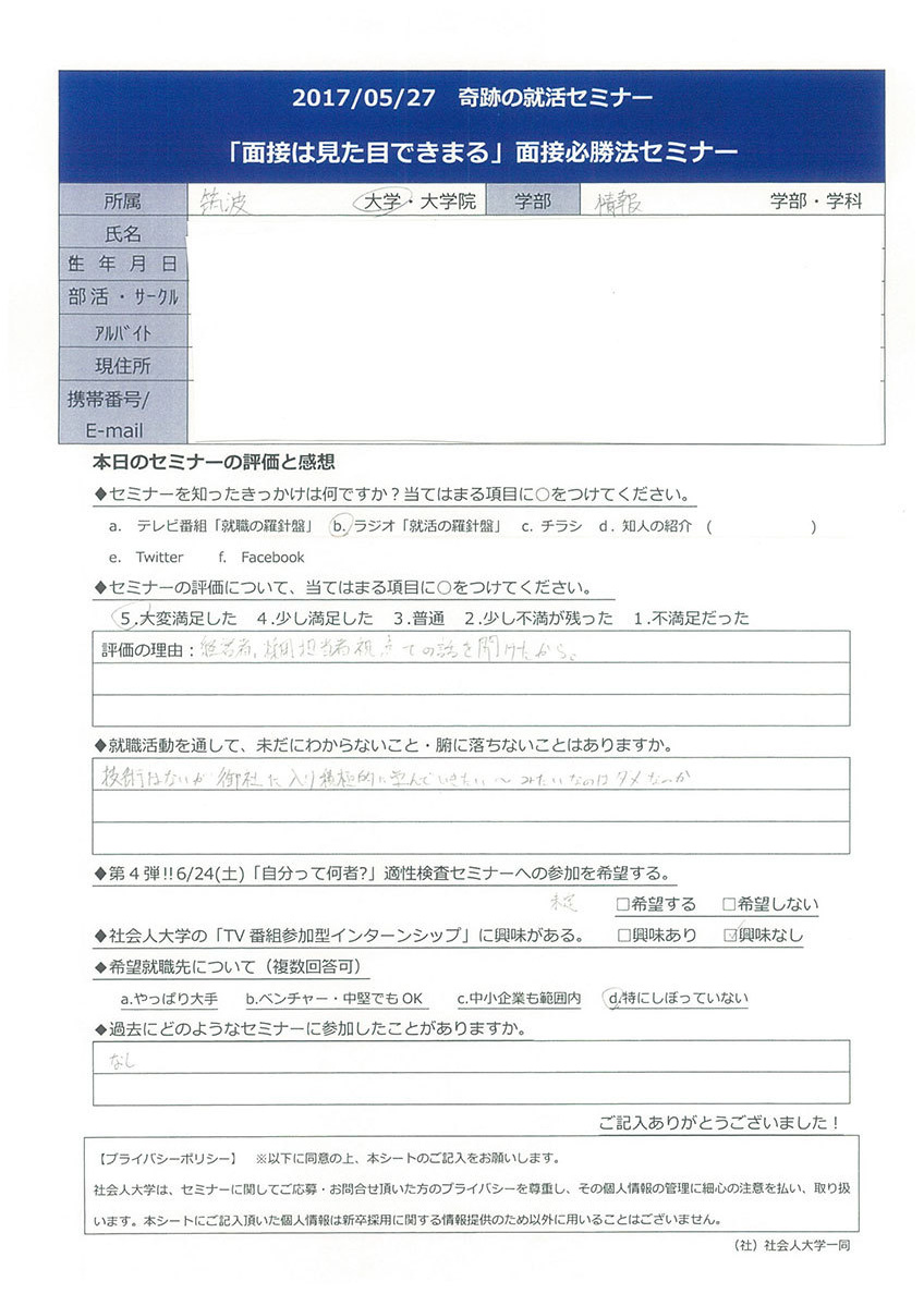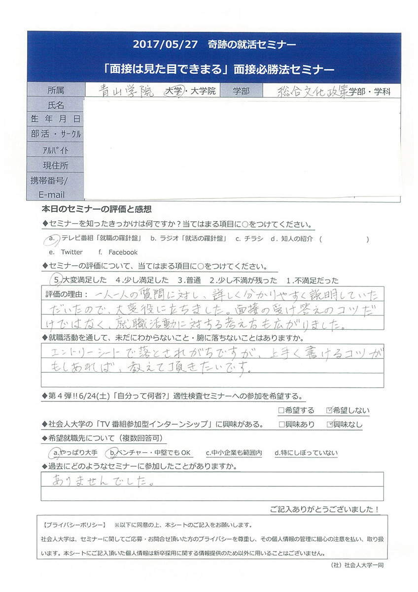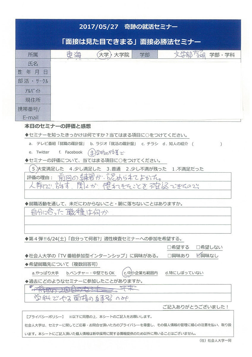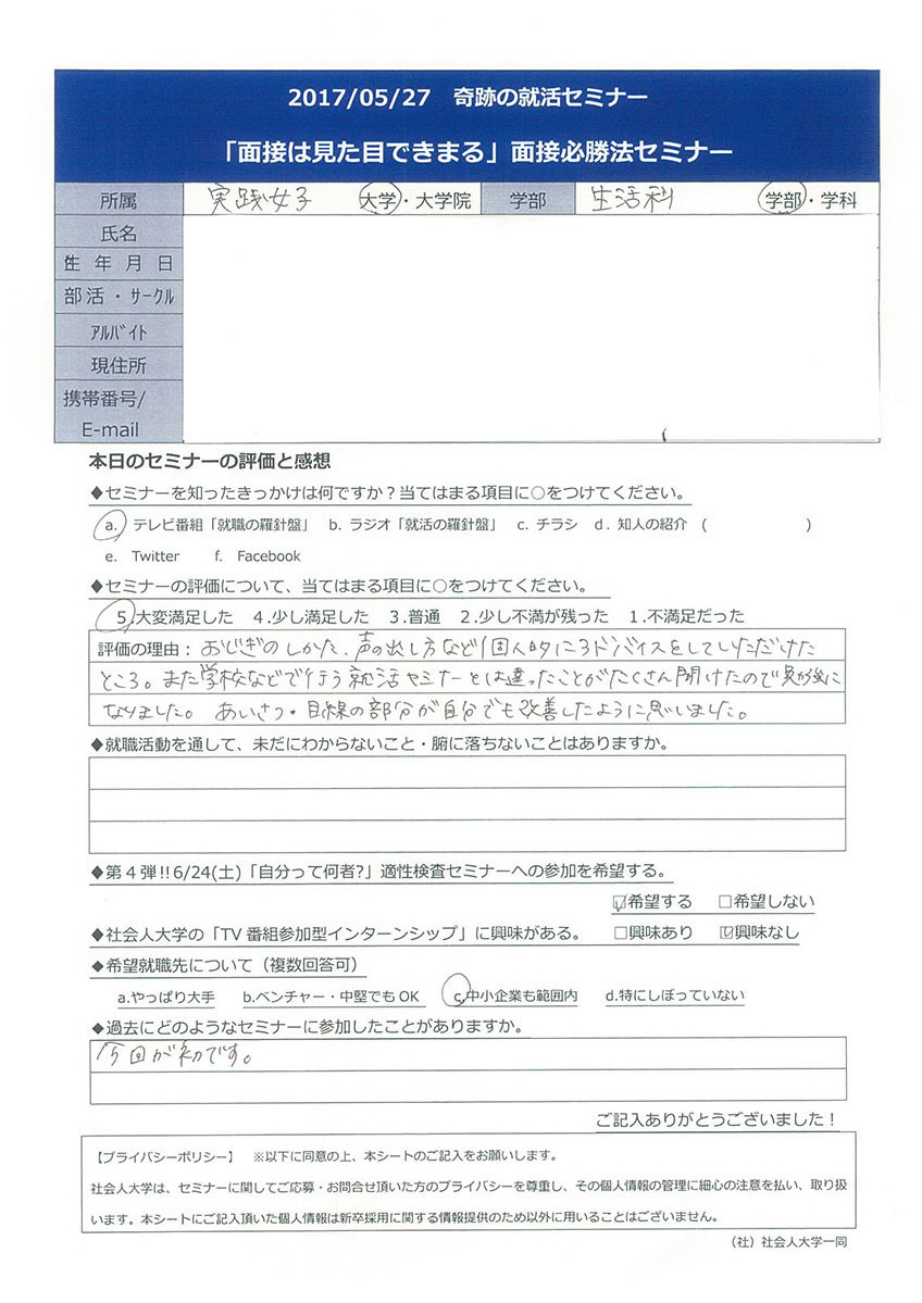 | 評価の理由 | おじぎのしかた、声の出し方など個人的にアドバイスをしていただけたところ。 また学校などで行う就活セミナーとは違ったことがたくさん聞けたので勉強になりました。 あいさつ・目線の部分が自分でも改善したように思いました。 |