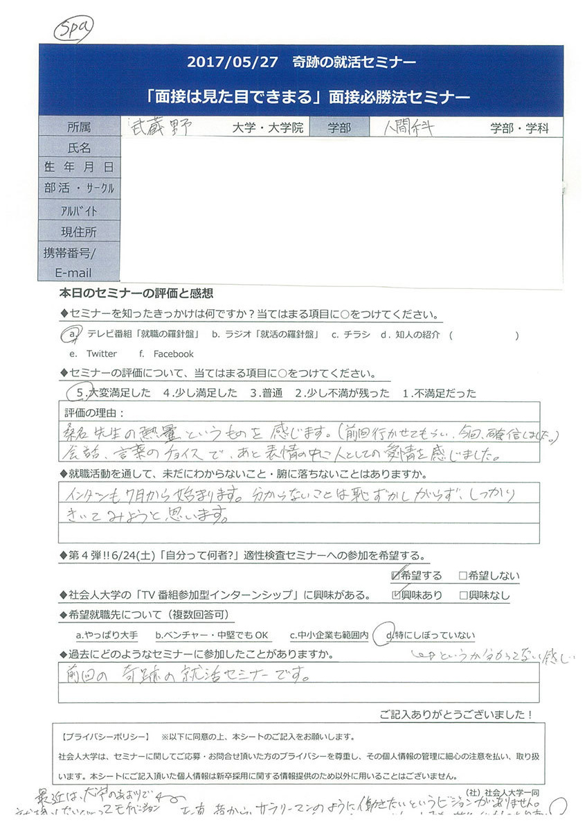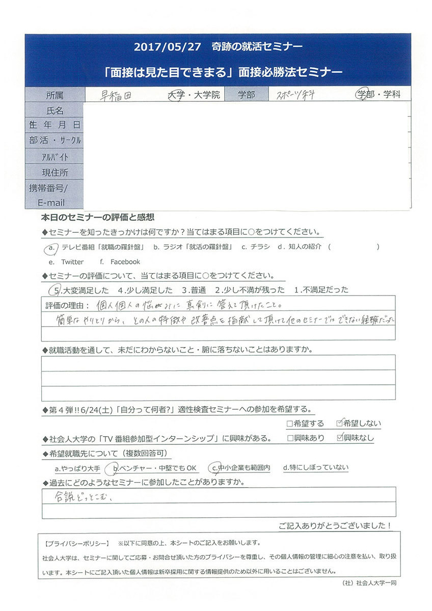 | 評価の理由 | 個人個人の悩みに真剣に答えて頂けたこと。 簡単なやりとりから、その人の特徴や改善点を指摘して頂けて他のセミナーではできない経験だった。 |