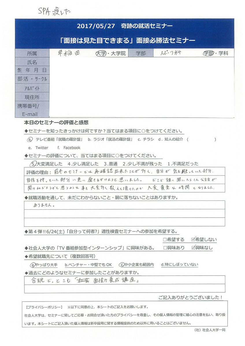 | 就職活動を通して、未だにわからないこと・腑に落ちていないことはありますか: | (なし) |