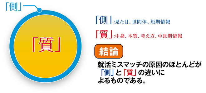 例えば、【「好きなこと」「嫌いなこと」=「自分の本質」】と思っている就活生が多いのですが、実はそれは間違いなのです。皆さんの知らない【「自分の強み」「自分の弱み」という自分の「質」】をしっかり理解することが重要なのです。社会に出て自分が思った以上にできないという新人社員が多いことからも、自分の「質」を理解していない人が多いという事が判りますね。